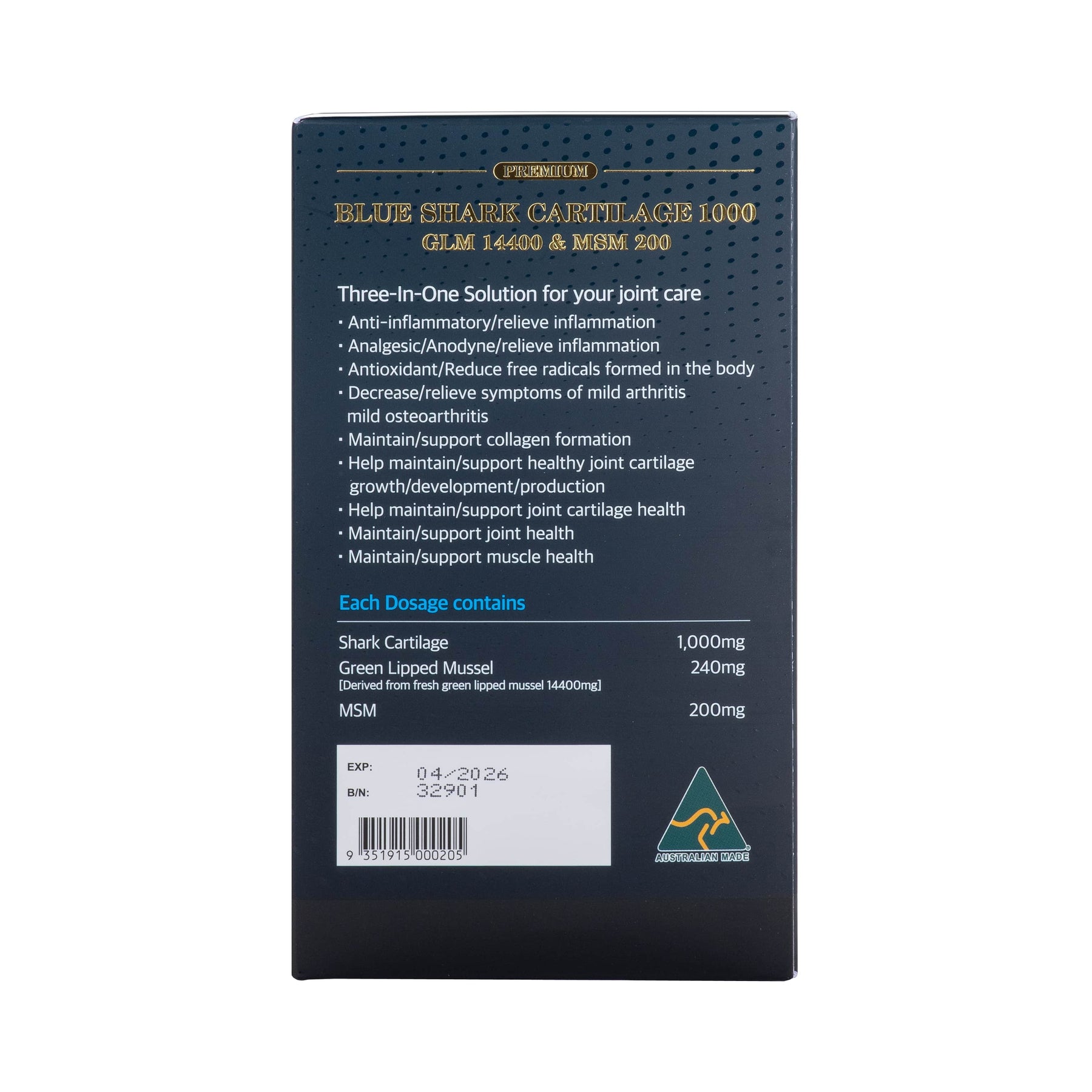 The combination of Shark Cartilage, Green Lipped Mussel & MSM is natural source of minerals (calcium, chondroitin and glucosamine), proteins, omega-3 fatty acid and glycosamino-glycans. Premium Blue Shark Cartilage 1000 with GLM 14000 & MSM 200 has antioxidant activity and supports general health and wellbeing.